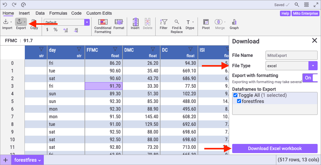 2. Click the `Export` button in the Mito toolbar, and select `Download File`.