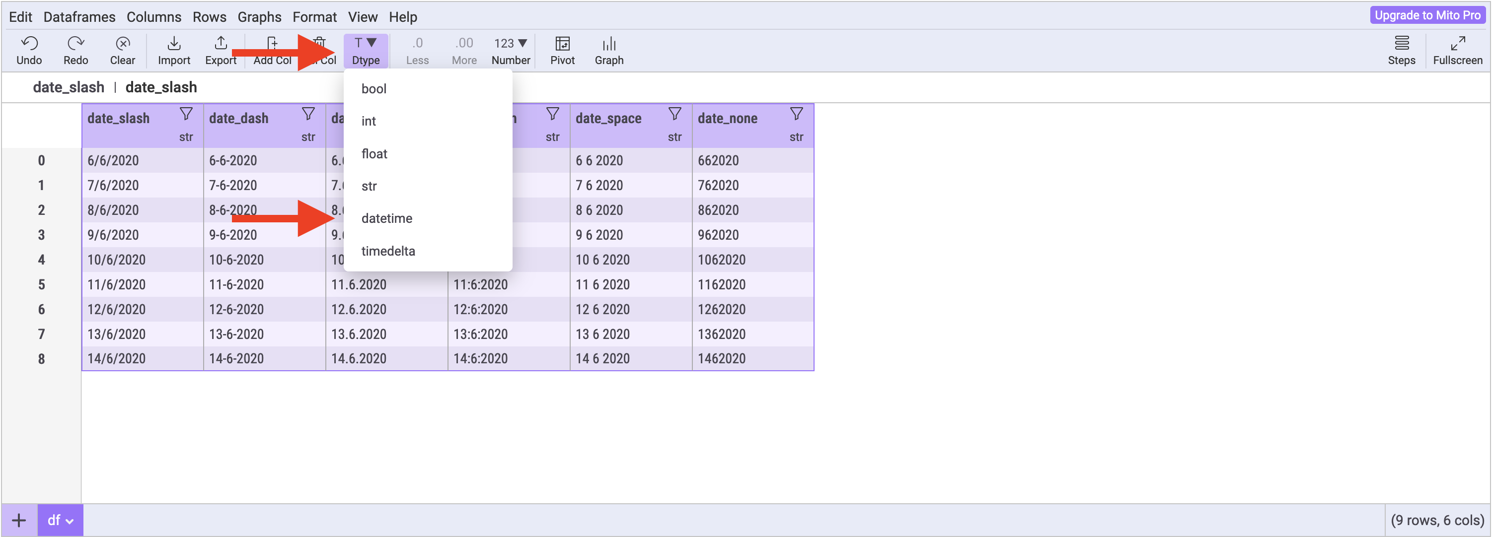 Click on the Dtype dropdown in the Mito toolbar and select a new dtype.